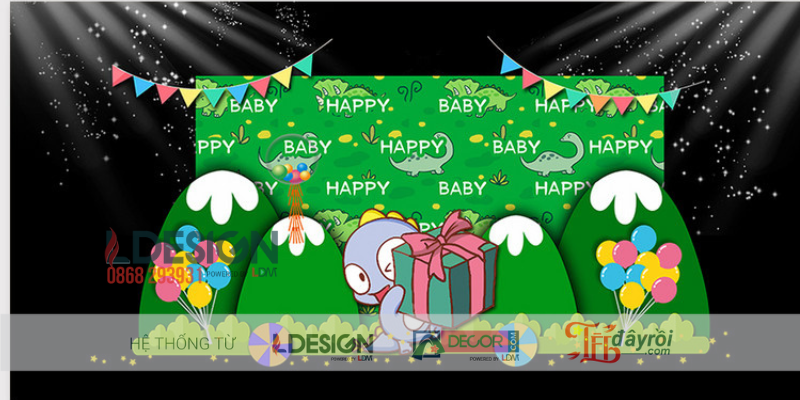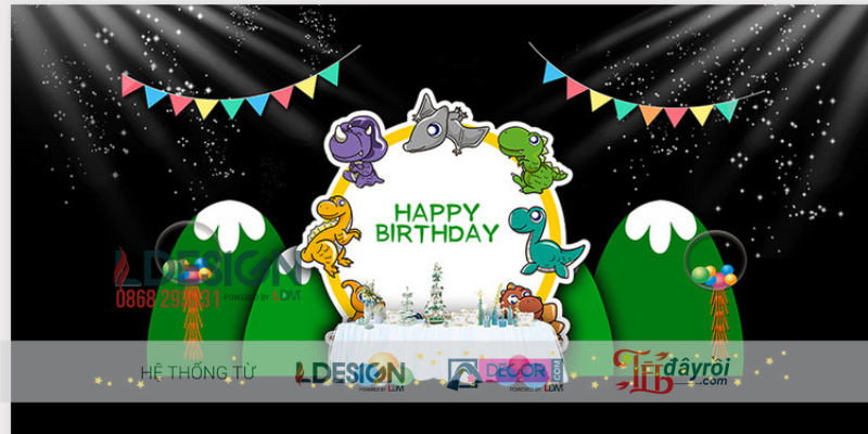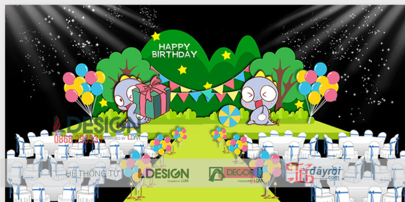Khu vực sân khấu là trung tâm của bữa tiệc và cũng là nơi mang lại hiệu ứng thị giác mạnh nhất. Thiết kế backdrop theo phong cách cartoon với những nhân vật đáng yêu, khung cảnh thiên nhiên vui nhộn cùng dòng chữ “Happy Birthday” nổi bật giúp khu vực này trở nên sáng bừng và đầy sức sống. Hệ thống ánh sáng tạo hiệu ứng lung linh giúp trẻ dễ dàng hòa mình vào thế giới hoạt hình sống động.